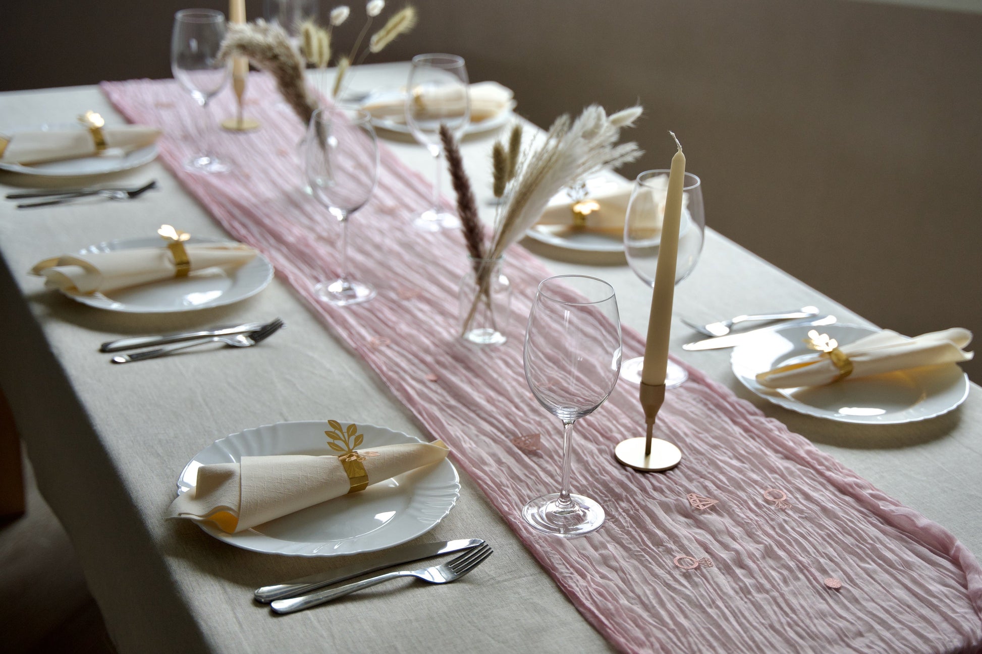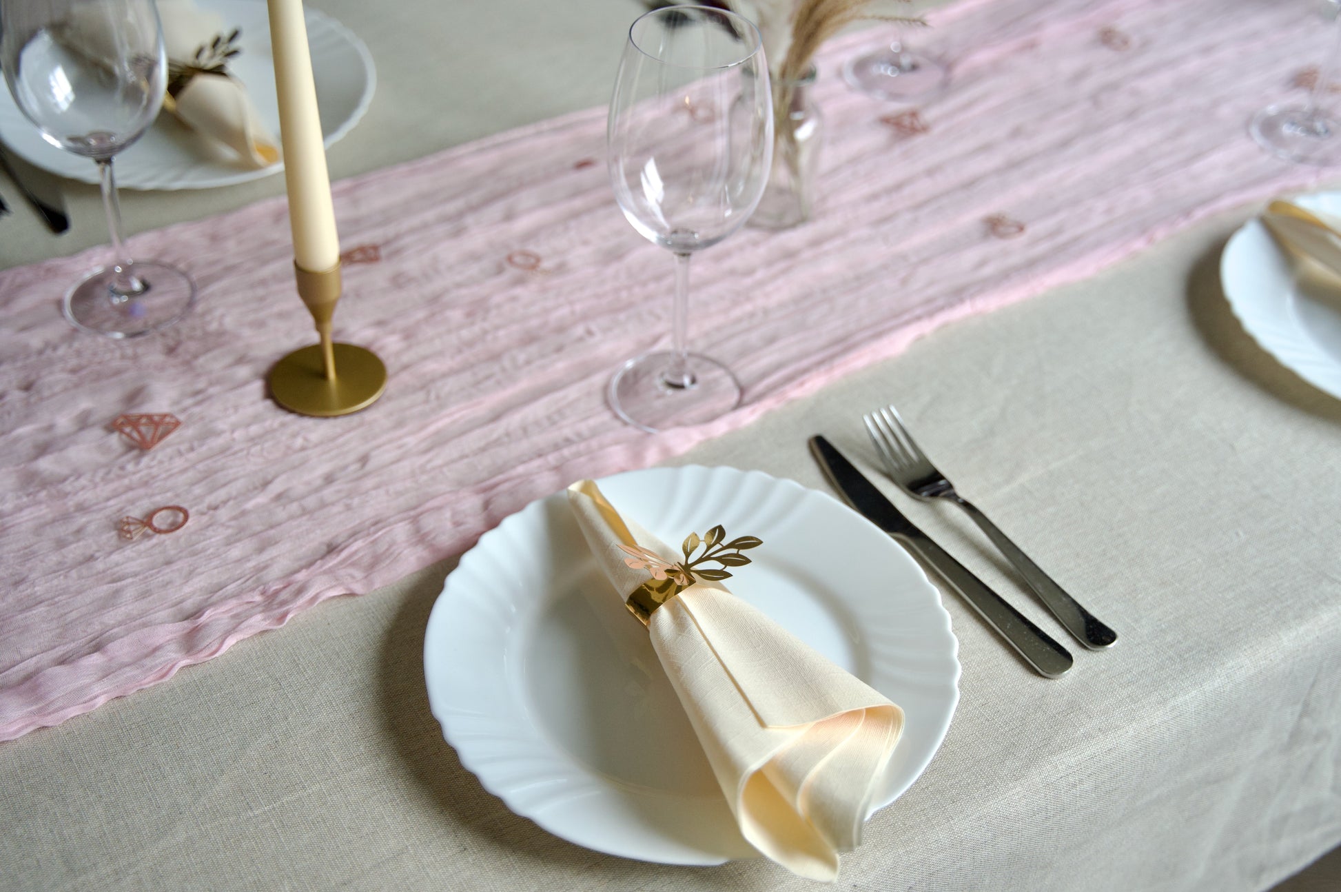 - Galda celiņš gaiši rozā krāsā: tavs audekls kulinārijas radošumam.